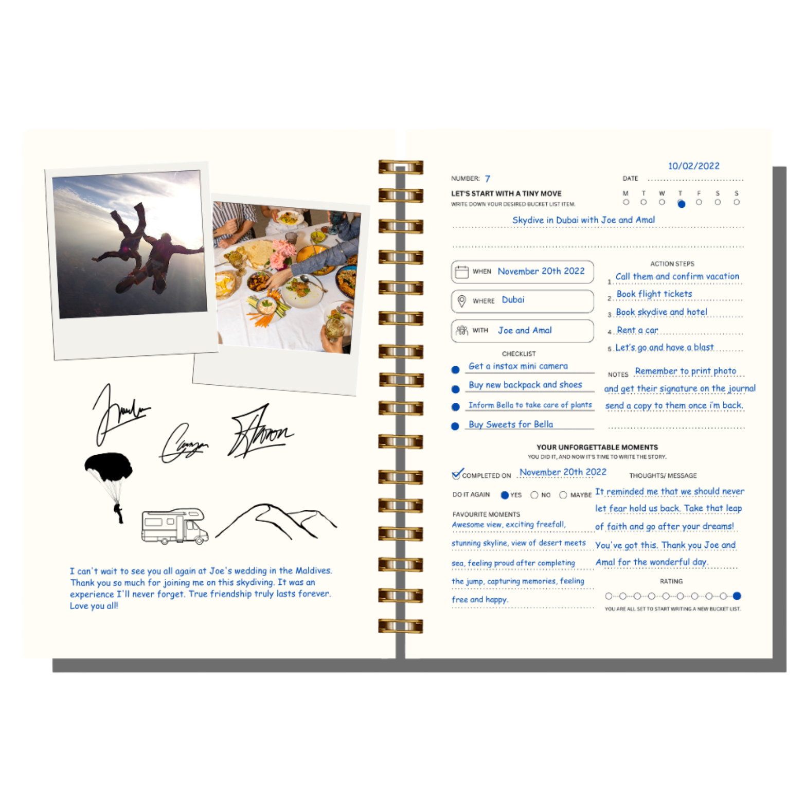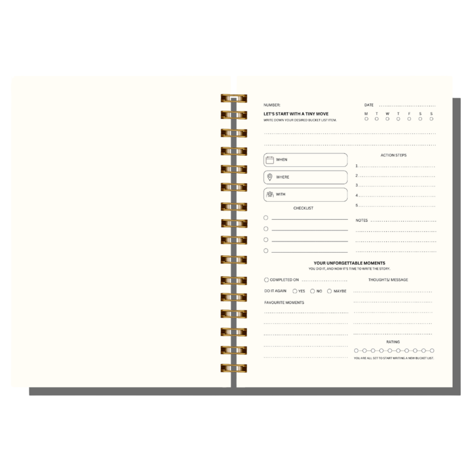 The left page gives space for photos or doodles, while the right page helps you note your bucket list goal, Plan action steps, and reflect once it’s done